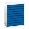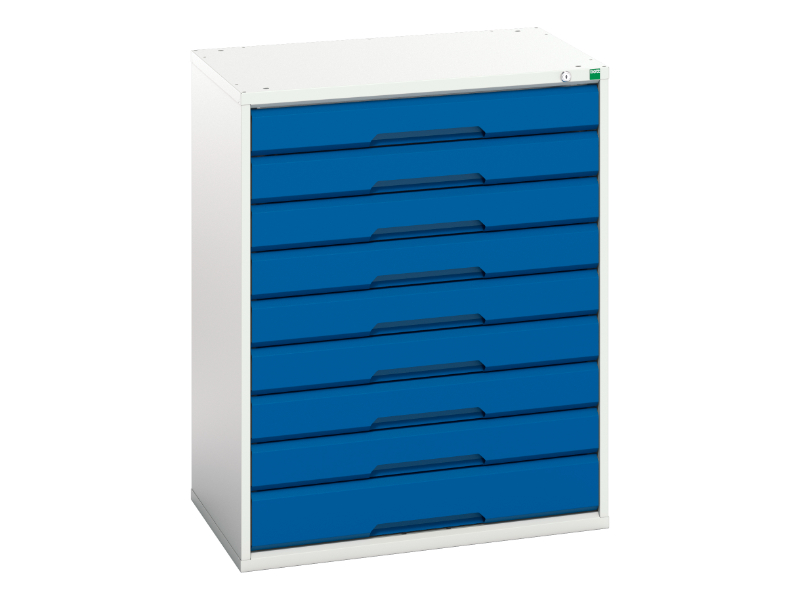 Verso drawer cabinet with 9 drawers. Featuring a robust, fully welded steel housing with 100% extension drawers. Drawer configuration: 8x 100mm, 1x 125mm (75kg U. D. L. ). Finished in durable powder coat paint in RAL 7035 light grey / RAL 5010 gentian blue. WxDxH: 800x550x1000mm.