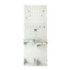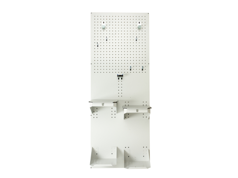 Cleaning station panel kit. Wall mounted panel based cleaning station with hook accessories for storing brooms and brushes and twin refuse bag holders with aluminium lids. Finished in durable powder coat paint in RAL 7035 light grey. WxH: 750x1981mm.
