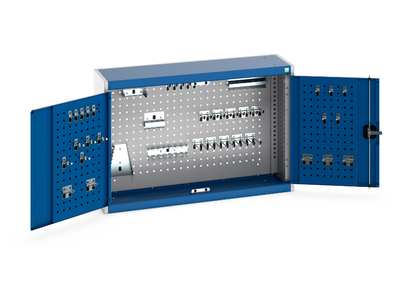 Cubio wall cupboard. Featuring a heavy duty, reinforced steel housing with up to 1 tonne total capacity with double, perfo panel lined, reinforced doors with perfo backpanel and 40 piece Hook kit. Finished in durable powder coat paint in RAL 7035 light grey / RAL 5010 gentian blue. WxDxH: 1050x325x700mm