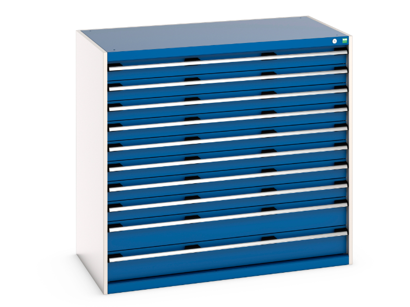 Cubio drawer cabinet with 10 drawers. Featuring a heavy duty, reinforced steel housing with up to 1 tonne total capacity and 100% extension drawers. Drawer configuration: 8x 100mm, 2x 150mm (75kg U. D. L. ). Finished in durable powder coat paint in RAL 7035 light grey / RAL 5010 gentian blue. WxDxH: 1300x750x1200mm.