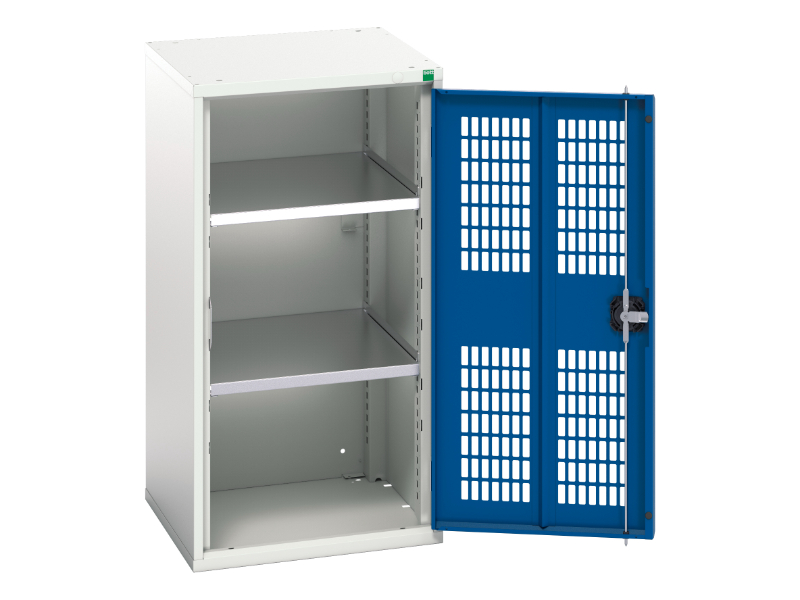 Verso shelf cupboard. Featuring a robust, fully welded steel housing with single, ventilated door with 2 adjustable height, galvanised steel shelves (75kg U. D. L. ). Finished in durable powder coat paint in RAL 7035 light grey / RAL 5010 gentian blue. WxDxH: 525x550x1000mm.