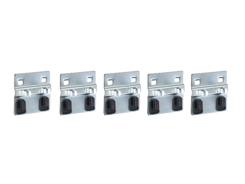 Perfo double spring clip 6-9mm. Steel construction with fast and secure perfolock clip on design with metal spring clip for holding items. For use with perfo panels. Supplied as a kit of 5. Finish: Zinc plated. WxDxH: 60x20x60mm